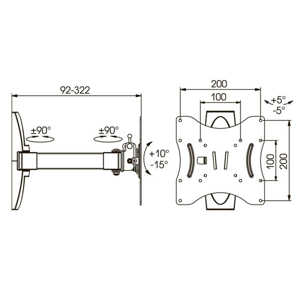 Настенный кронштейн для LCD/LED TV 15"-37" с наклоном (-15/+15 градусов), поворотом (2 степени свободы) и выносом от стены (92 - 322 мм), VESA 75х75, 100х100, 200х100, 200х200, max 35 кг, защита от падения TV, возможность корректировки перекоса кронштейна при монтаже, цвет: темно-серый.
